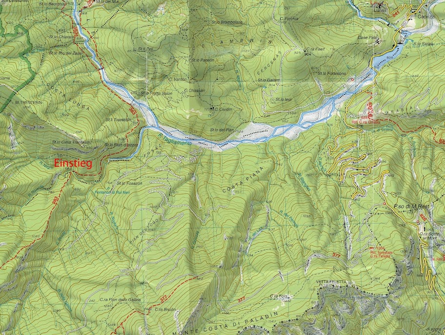 Die Schlucht schaut auf jeden Fall super aus - viel Wasser, 3 Abseiler bis 20m und viele Sprünge (Friauler Version vom Bodengo 2). Der Abschnitt oberhalb von der Kreuzung mit dem Wanderweg 383 soll mühsam sein.
